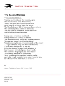 Turning and turning in the widening gyre The falcon cannot hear the falconer; Things fall apart; the centre cannot hold; Mere anarchy is loosed upon the world, The blood-dimmed tide